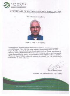 Prof. J.C.Das received a certificate of recognition and appreciation for his incredible work with AGV, one of the best devices used in glaucoma surgery.